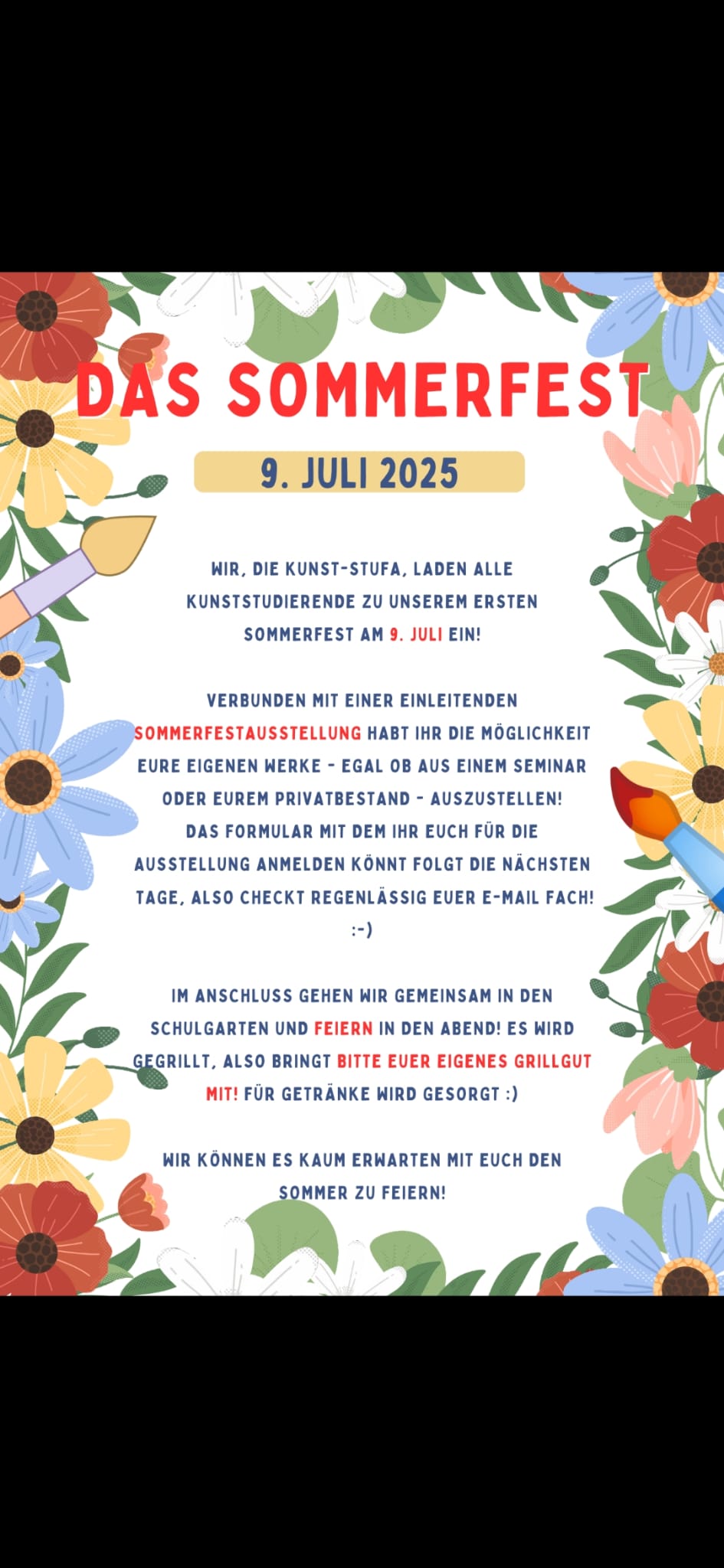 Bevor wir den Abend mit Grillen, Musik, Programm und guter Laune im Schulgarten genießen, starten wir mit einem besonderen Highlight: Eine Kunstausstellung im Schlossbau ab 16:00 Uhr, bei der ihr selbst eure Werke zeigen könnt!